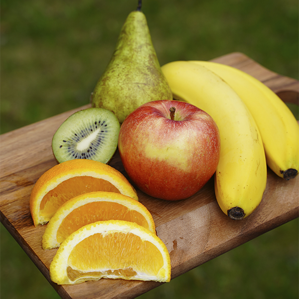 Hedelmälautanen koostuu mahdollisuuksien mukaan kauden hedelmistä ja marjoista.
