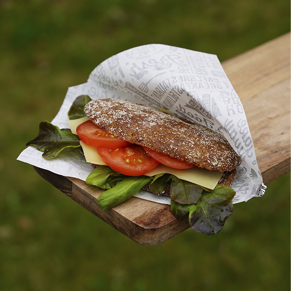 Ruisleipä, jossa täytteenä juusto, tomaatti sekä raikas salaatinlehti.