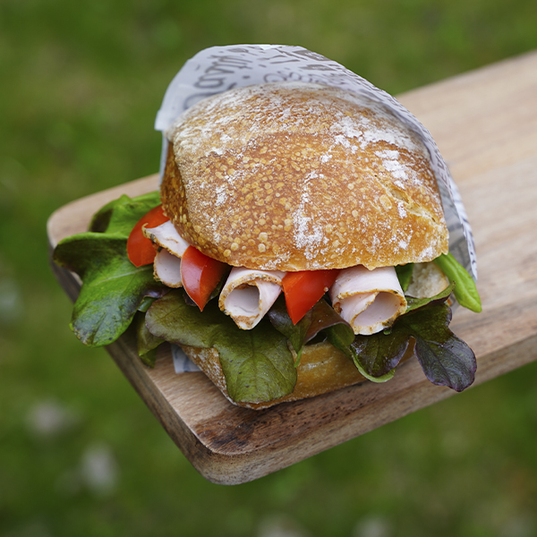 Sämpylä, jossa täytteenä kinkku, paprika sekä raikas salaatinlehti.